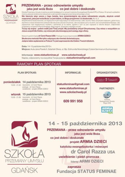 Było to pełne ekspresji nauczanie i sięgająca do głębi duszy. Usłyszeliśmy od czego zależy nas sposób myślenia, jak tworzą się nasze systemy myślenia i fałszywe przekonania; poznaliśmy jakim zagrożeniem są "twierdze umysłu" o których mówi św. Paweł, czyli zakłamania, w których trzymają nas własne zranienia, albo złe duchy. Dzięki modlitwie uwielbienia i modlitwie wstawienniczej doświadczyliśmy działania Boga, który przychodzi zbawić człowieka i przemienić jego życie.